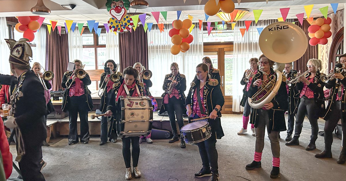 Op deze vrijdagmiddag voor het carnavalsweekend komen de Hoogheden met groot gevolg van OCV de Kadolstermennekes een aantal uurtjes bij ons op bezoek. Ze werden ook dit jaar weer door hun vaste hofkapel āDe Olnāzelse Kƶpperbloazersā muzikaal begeleid.