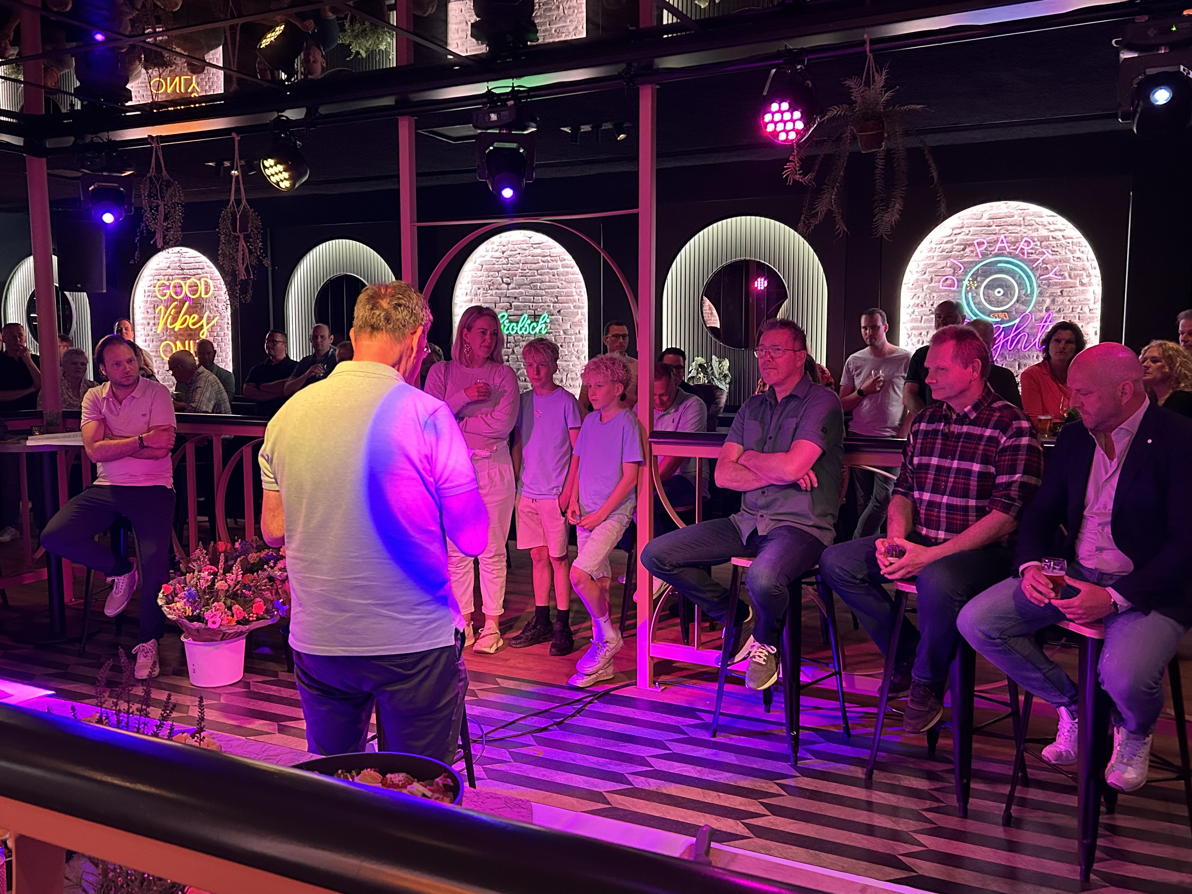 Toen iedereen zich had begeven naar de prachtige “discokelder”, hebben Hans en Luuk Olde Monnikhof de jubilarissen toegesproken en hen gefeliciteerd.