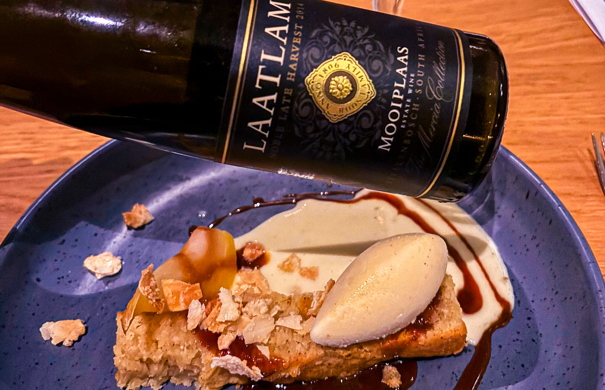 Het diner werd afgerond met de Mercia Laatlam Noble Late Harvest Sauvignon Blanc. Deze dessertwijn combineert geconcentreerde aroma’s van abrikoos, honing en amandel met een frisse zuurgraad. Samen met de saffraan-peer en het amandeldessert van Southern Cross vormde dit een elegante afsluiting van een uitgebalanceerde avond.