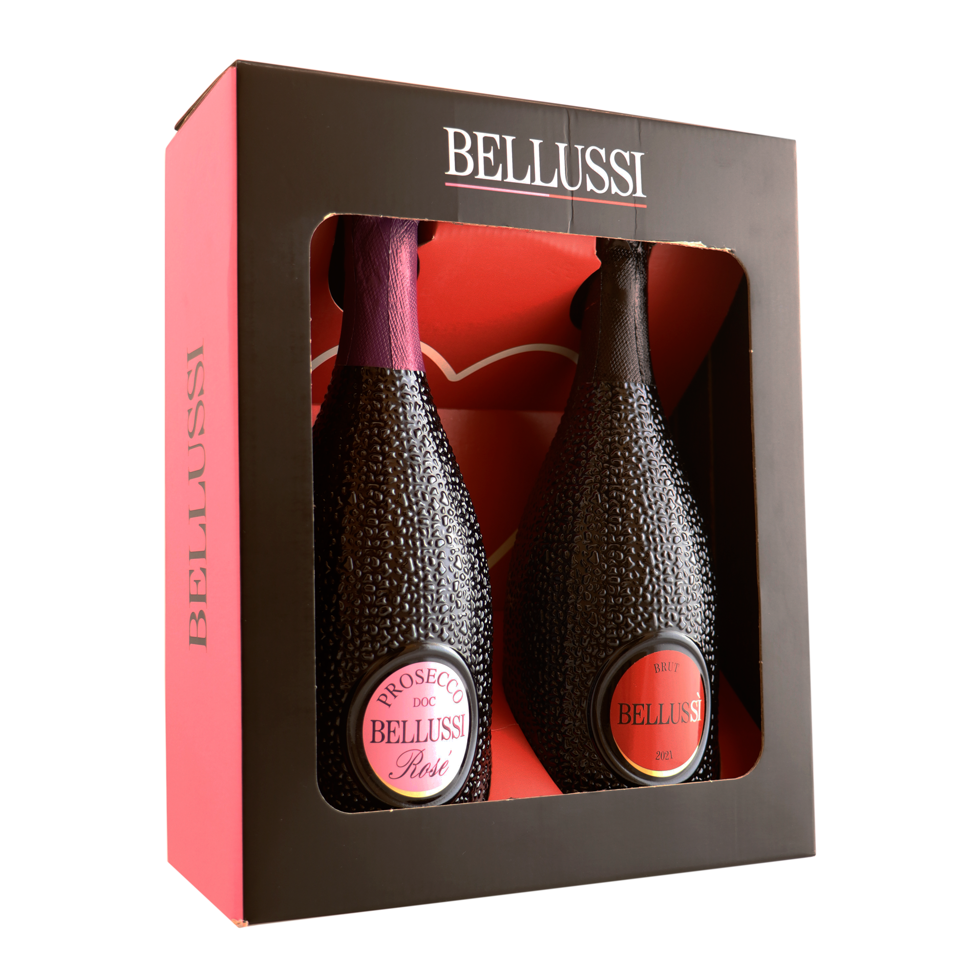 Een mooie geschenkverpakking waarin de twee bijzondere flessen van Bellussi prachtig uitkomen: de Cuvée Prestige en de Prosecco Rosé brut.