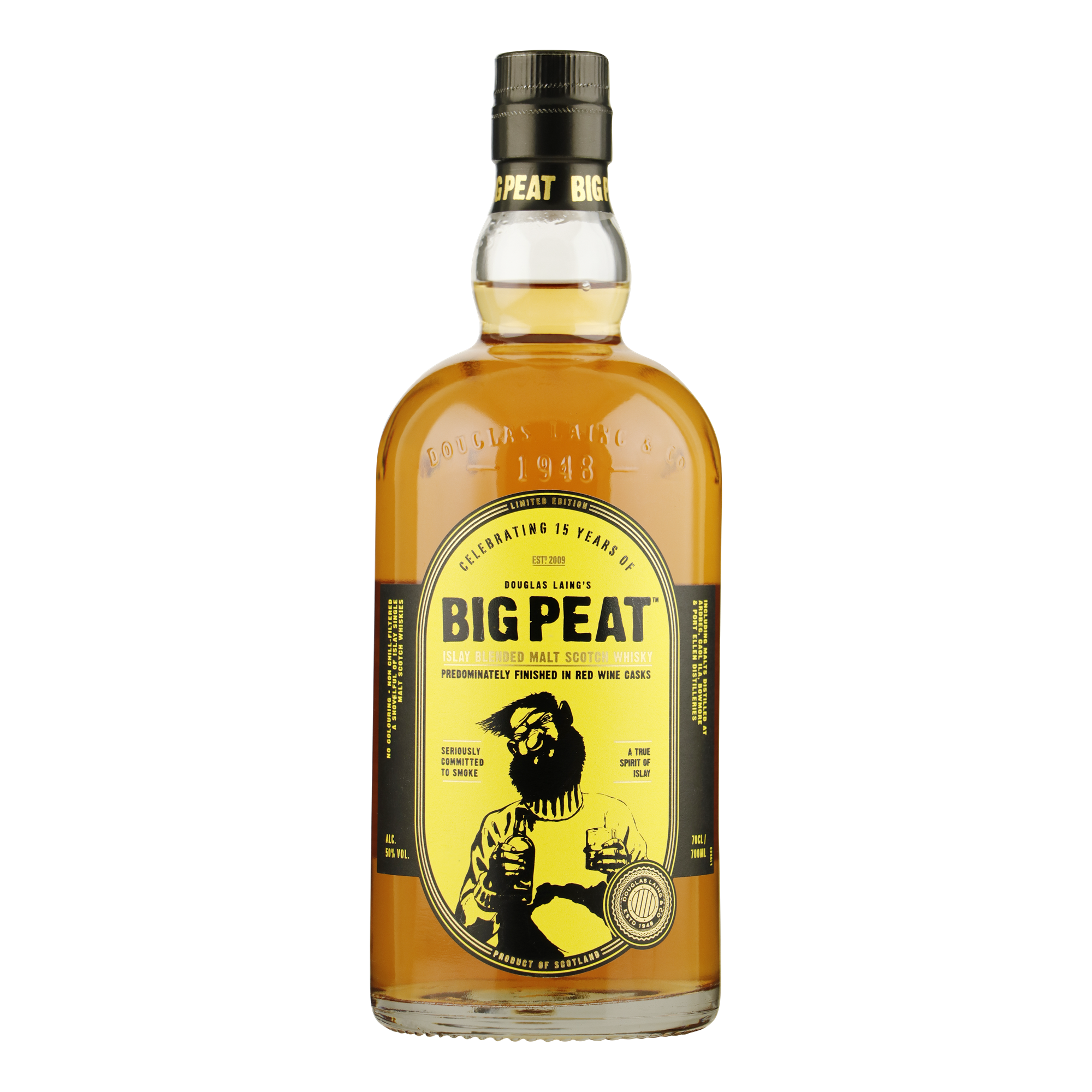De populaire Islay Blended Malt whisky dat al 15 jaar enorm geliefd is onder whiskyliefhebbers, komt voor zijn 15-jarige jubileum met een Red Wine Cask Finish. De zwaar rokerige, ziltige, en asachtige malts die terug zijn te vinden in Big Peat combineren in deze botteling met het fruitige en nootachtige van de rode wijnvaten. Elke slok zorgt voor een feest aan smaken!