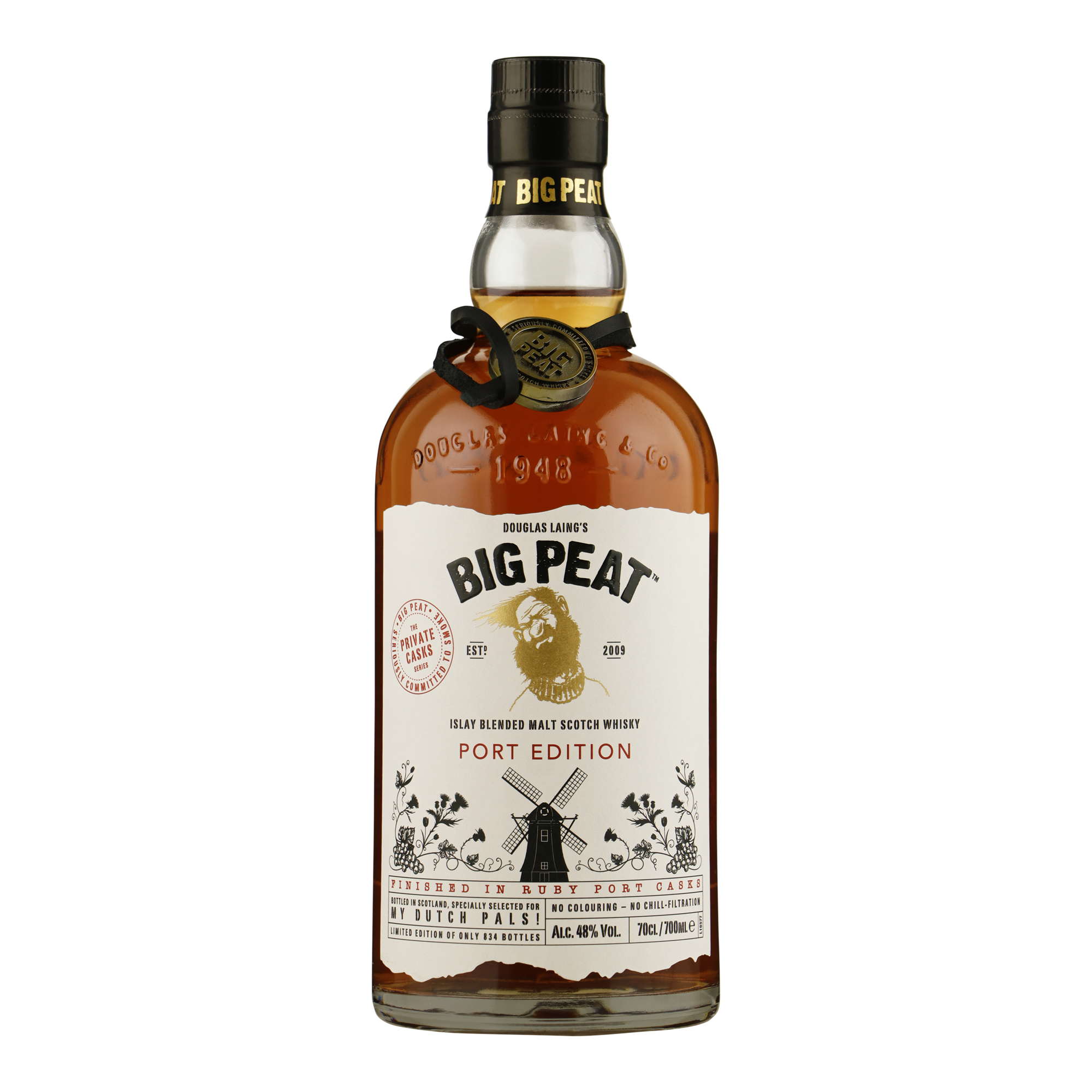 Big Peat heeft altijd een speciale band gehad met Nederland. Dit jaar laat hij dat opnieuw zien met deze geweldige limited edition, exclusief voor Nederland. De krachtige Islay-smaak krijgt een extra fruitige dimensie door de rijping op ruby portvaten. De fles is versierd met een typische Nederlandse windmolen en is speciaal gebotteld voor de trouwe Nederlandse fans van Big Peat.
