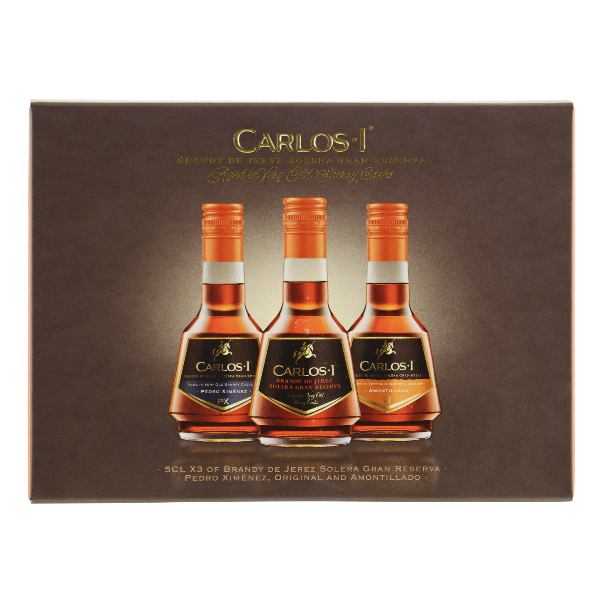 Carlos I giftpack voorzien van 3x5cl met Carlos I Brandy, Carlos I Amontillado Brandy, Carlos I Pedro Ximenez Brandy.