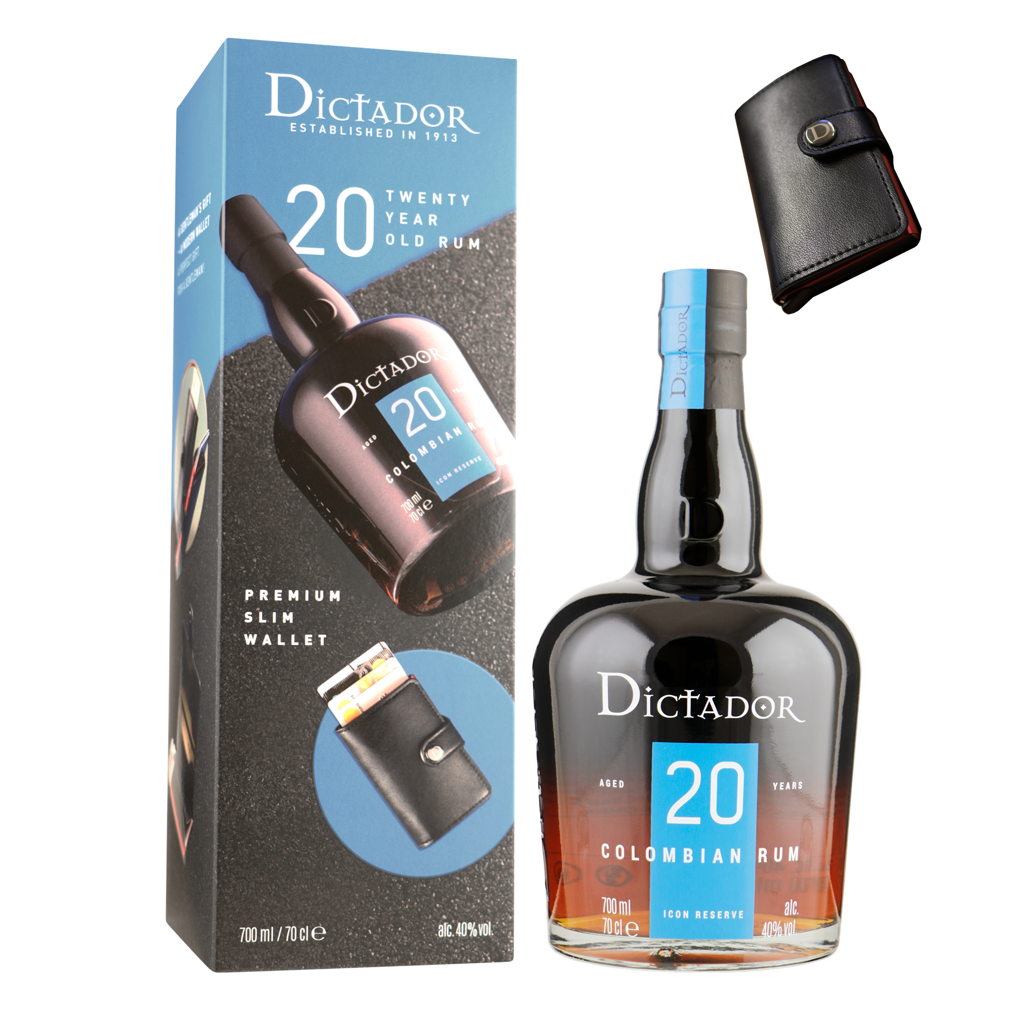 Deze geschenkverpakking bevat een fles Dictador 20YO en een luxe portemonnee. Het ideale cadeau!