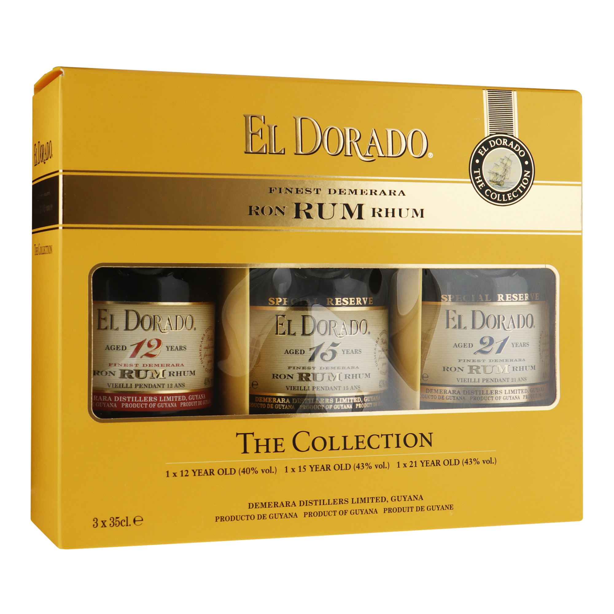 Deze fraaie giftpack van El Dorado rum bevat 3x 0,35 ltr flesjes van de premium range: