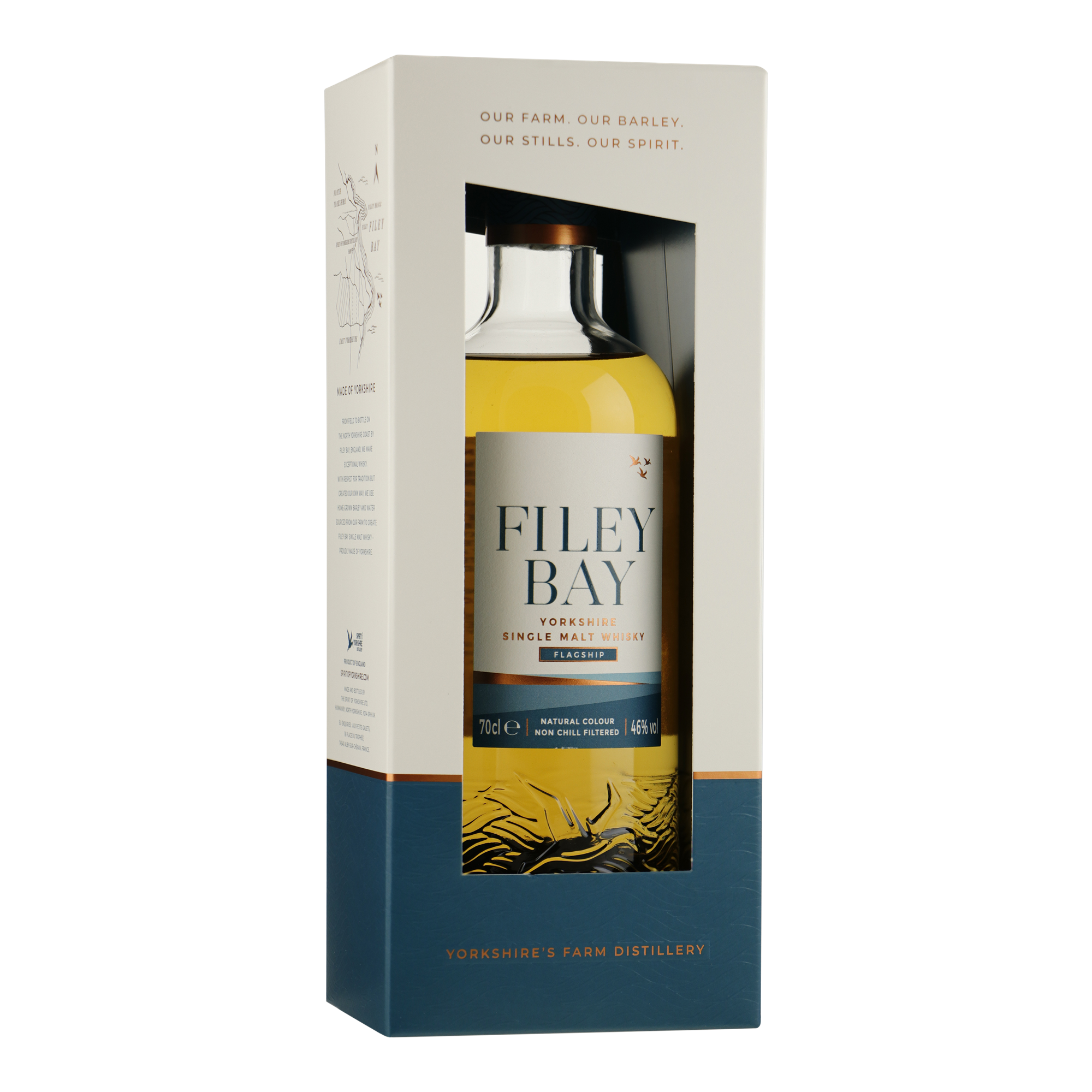 De Spirit of Yorkshire Distillery, waar Filey Bay wordt geproduceerd, heeft volledig controle over elk aspect van het productieproces – van de teelt van gerst tot het bottelen. Deze aanpak, bekend als 'van veld tot fles', benadrukt hun toewijding aan kwaliteit en duurzaamheid. Hun investering in twee grote Forsyth pot stills en een unieke 'four-plate' koperen kolom zorgt voor een verfijnd, diep whiskyprofiel dat de kustsfeer van Yorkshire perfect weerspiegelt.