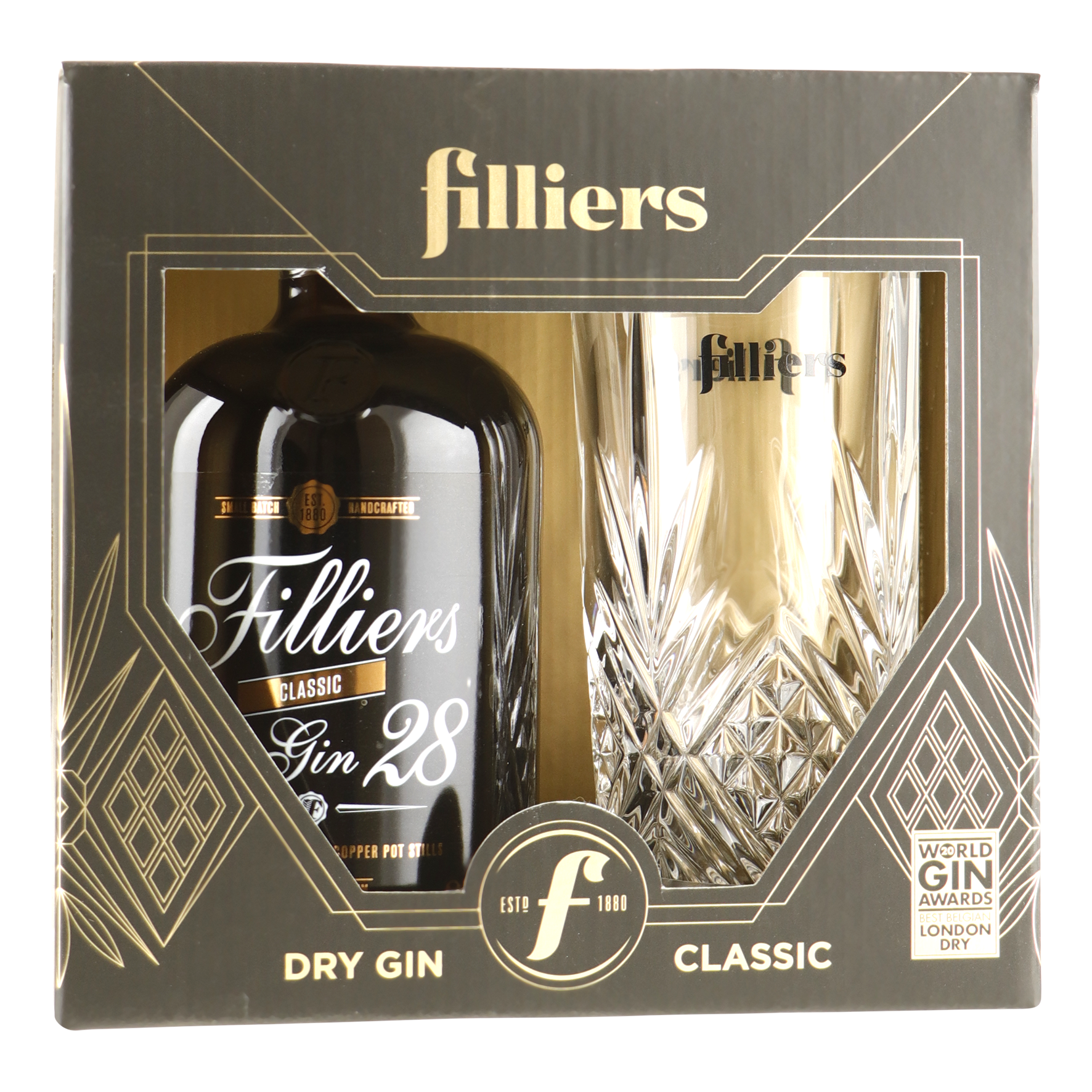 Deze geschenkverpakking bevat één fles Filliers Dry Gin 28 classic en een prachtig glas.