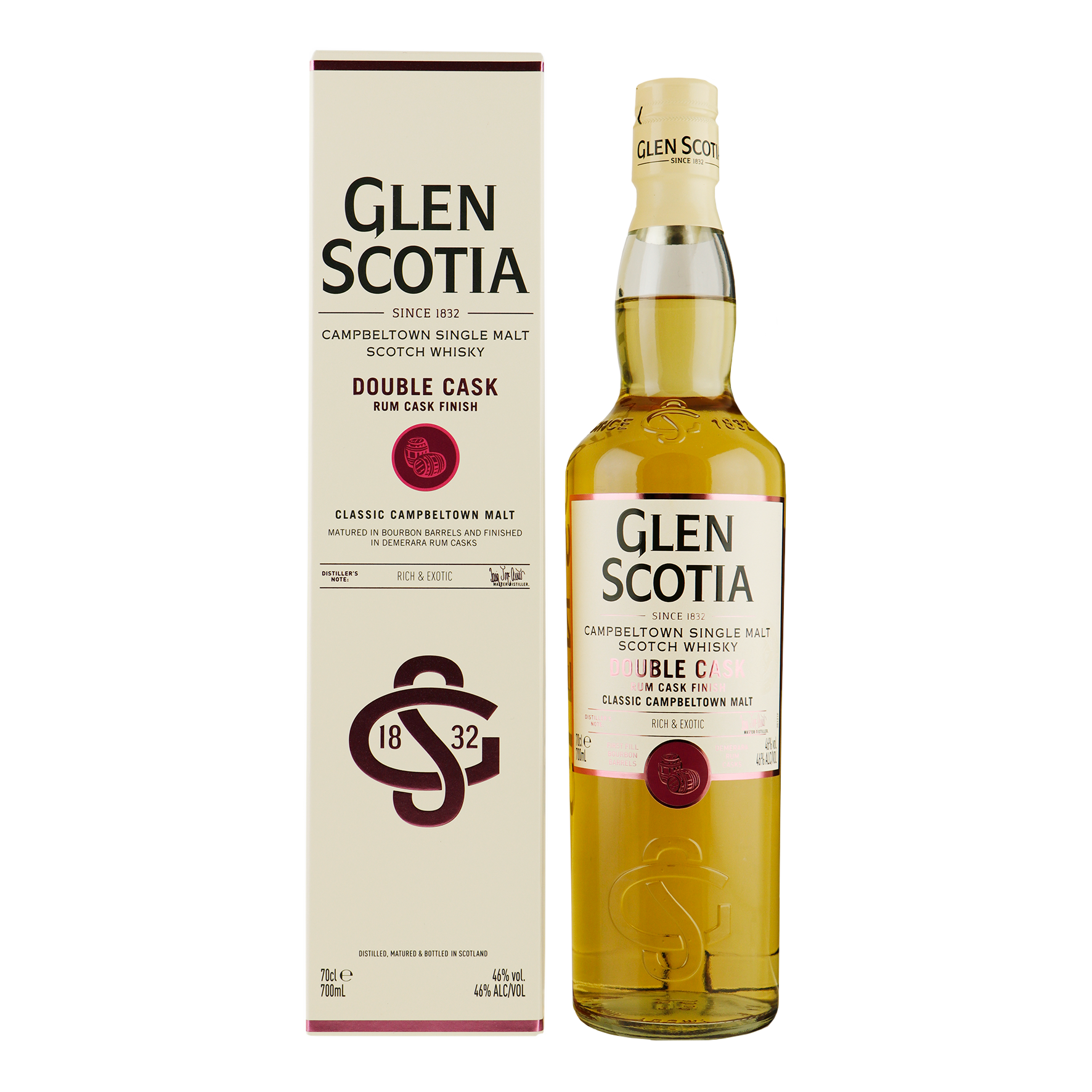 Voor de Glen Scotia Double Cask Rum Finish heeft de whisky eerst een rijping ondergaan in first fill bourbon vaten. Daarna is de whisky in rum vaten gedaan om nog tenminste acht maanden te rijpen. De rum vaten komen uit Guyana en zijn hier gebruikt voor de fabuleuze Demerara rum.