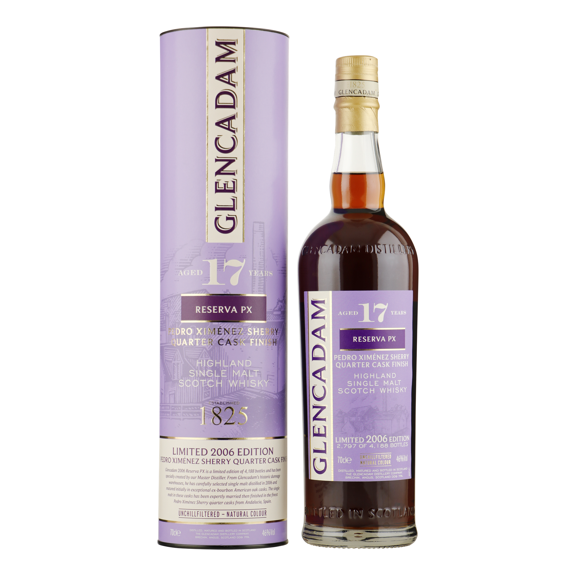 Glencadam 17YO PX Quarter Cask Finish 2006 is een single malt die zijn rijping begon op ex-bourbonvaten en daarna verder rijpte in Pedro Ximénez-sherry quarter casks uit Andalusië. Deze kleine vaten intensiveren de interactie met het hout, wat resulteert in een complexe whisky met rijke sherrytinten en subtiele zoetheid.
