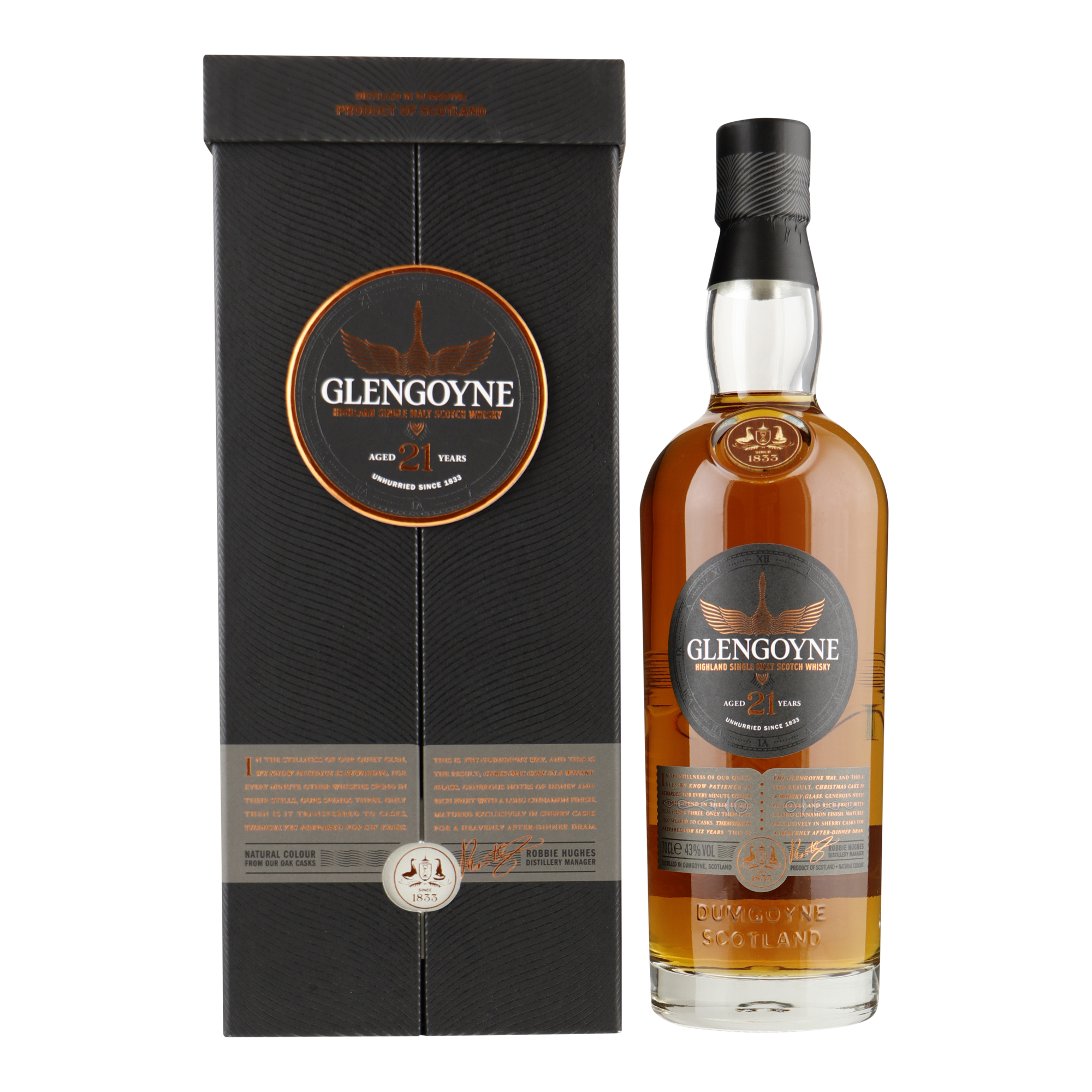 Toen Glengoyne de 21yo opnieuw uitbracht, was het belangrijkste doel om deze expressie duidelijk onderscheidend te maken en als een luxe whisky te presenteren. De fles ziet er nog steeds hetzelfde uit maar de traditionele kartonnen koker is vervangen door een mooie doos. Het feit dat de 21yo voor 100% sherry gerijpt is, is al een luxe op zich omdat sherryvaten aanzienlijk duurder zijn en daarom meestal slechts met mate worden gebruikt. De sherry invloed is intens maar het karakter van de distilleerderij schijnt er nog doorheen.