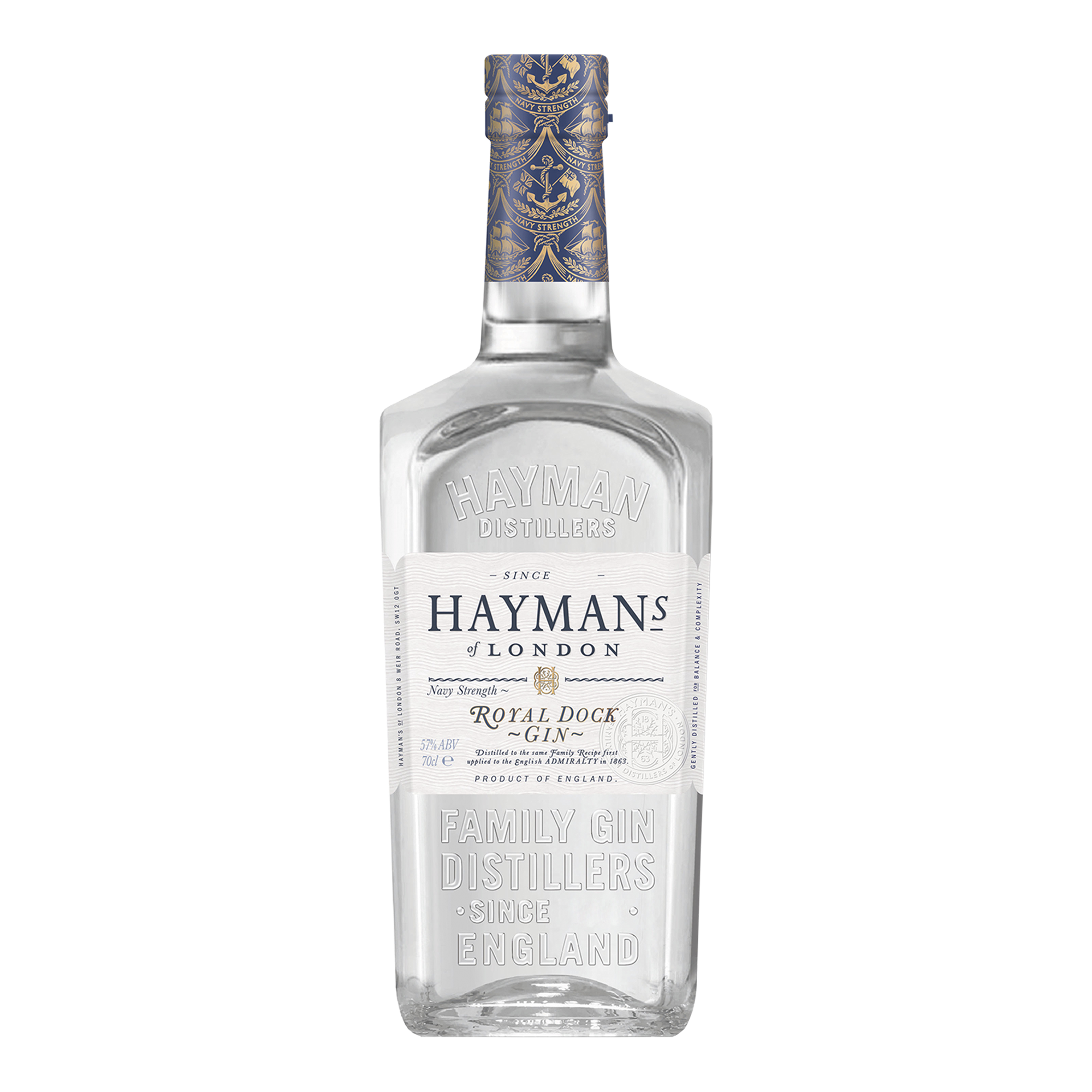 Gevestigd in Londen, leverde Hayman's de Royal Dock Gin aan de Royal Victoria Yard, de grootste van de drie Admiralty Victualling Boards voor wie Gin samen met Rum een essentieel onderdeel van de lading was. De naam Royal Dock vertegenwoordigt de werf die in 1513 werd opgericht door Henry VIII in Deptford, Zuid-Londen. Londen was toentertijd de grootste haven in Engeland naast de andere kleinere havens van Gosport en Plymouth. Meer dan 4 eeuwen was de Royal Dock het hoofdkwartier van "the Navy Victualling Board" die verantwoordelijk waren voor de proviand aan boord en daarmee ook de basis van een aantal van de belangrijkste ondernemingen in de Britse Marine geschiedenis. Een eerbetoon aan vervlogen tijden van de Engelse marine. Een robuuste, intense Gin met 57% alcohol. Kraakhelder, in zijn smaken aromatisch, bloemig en krachtig.