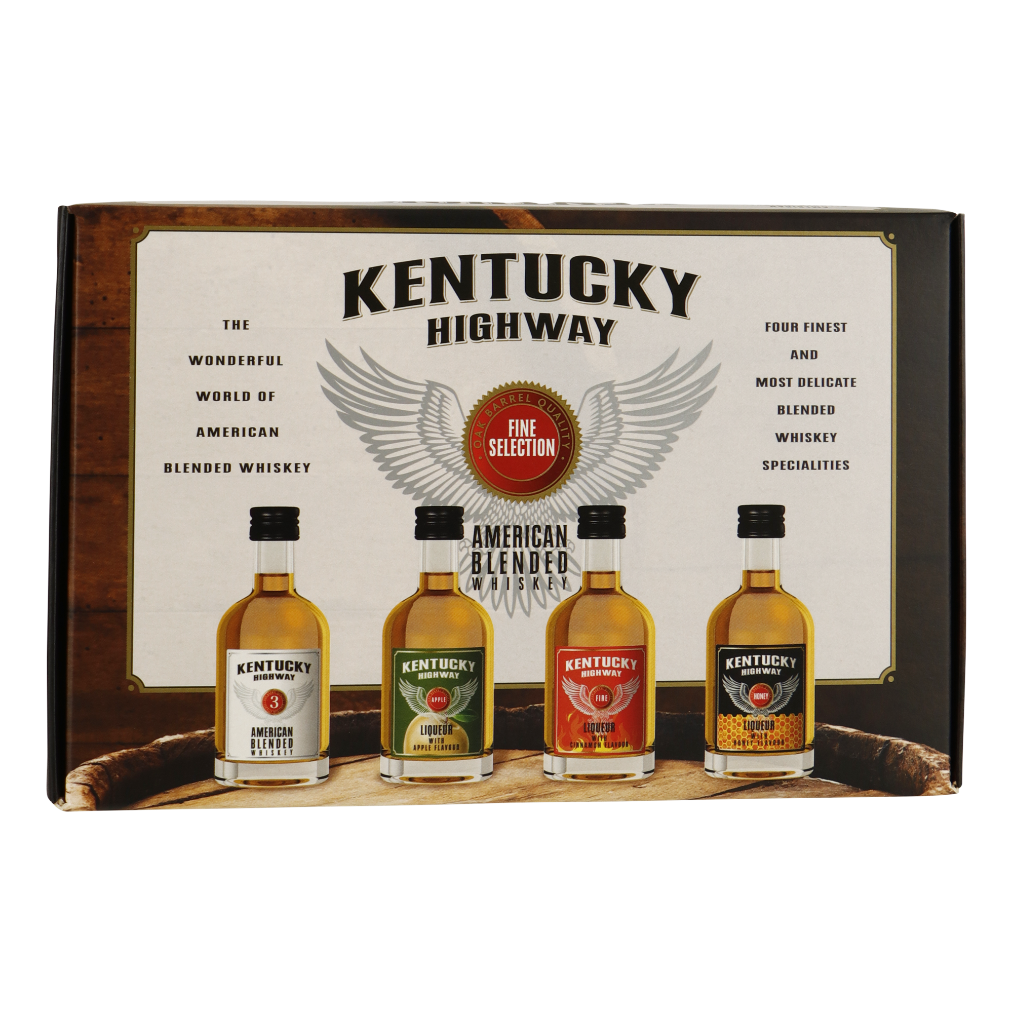 Deze geschenkverpakking bevat 4 x 5cl whisky specialiteiten van Kentucky Highway:
