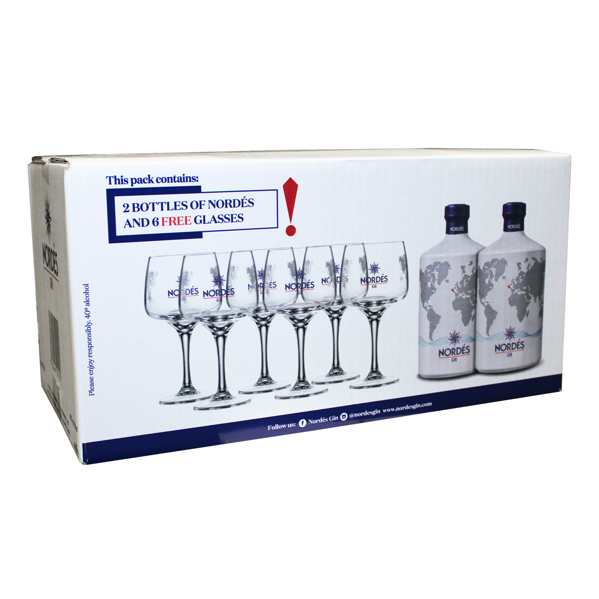 Deze verpakking bevat twee flessen Nordés 0,7L en zes bijpassende Nordés Copa glazen.