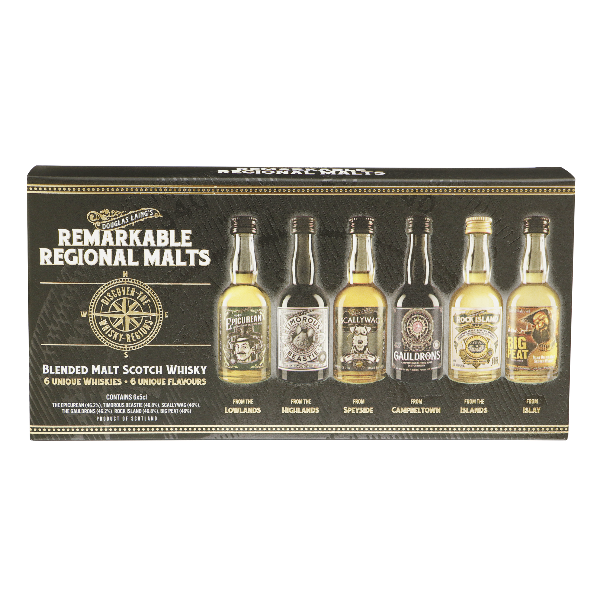 Remarkable Regional Malts: The Epicurean (Lowland), Timorous Beastie (Highland), Scallywag (Speyside), Rock Island (Islands) Big Peat (Islay), The Gauldrons (Campbeltown).