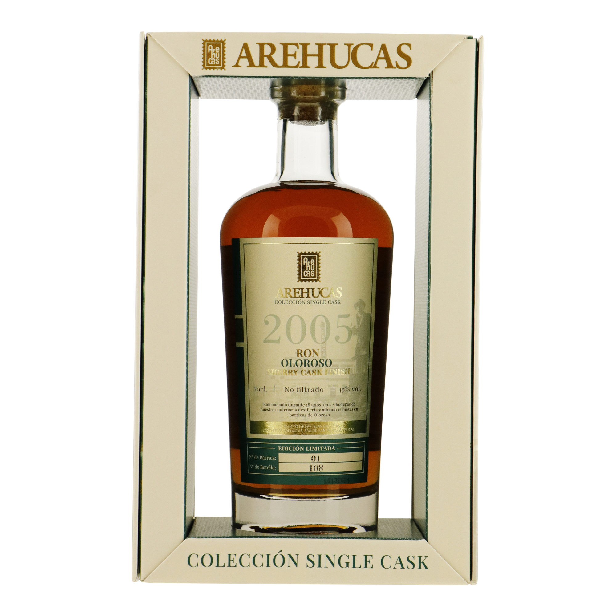 Deze exclusieve rum van Ron Arehucas is een ware traktatie voor liefhebbers van ambachtelijk gerijpte distillaten. Gedistilleerd in 2005 en 18 jaar lang gerijpt op Amerikaans eiken, heeft deze rum een diepe, complexe smaak ontwikkeld. De extra rijping van 12 maanden in Oloroso sherryvaten voegt een verfijnde laag van gedroogd fruit en notige tonen toe. In de neus komen rijke aroma’s van vanille, karamel en specerijen naar voren, terwijl de smaak wordt gekenmerkt door gekonfijt fruit, noten en een subtiele kruidigheid. Elke fles is individueel genummerd, ongefilterd en met de hand gebotteld, waardoor de pure essentie behouden blijft.