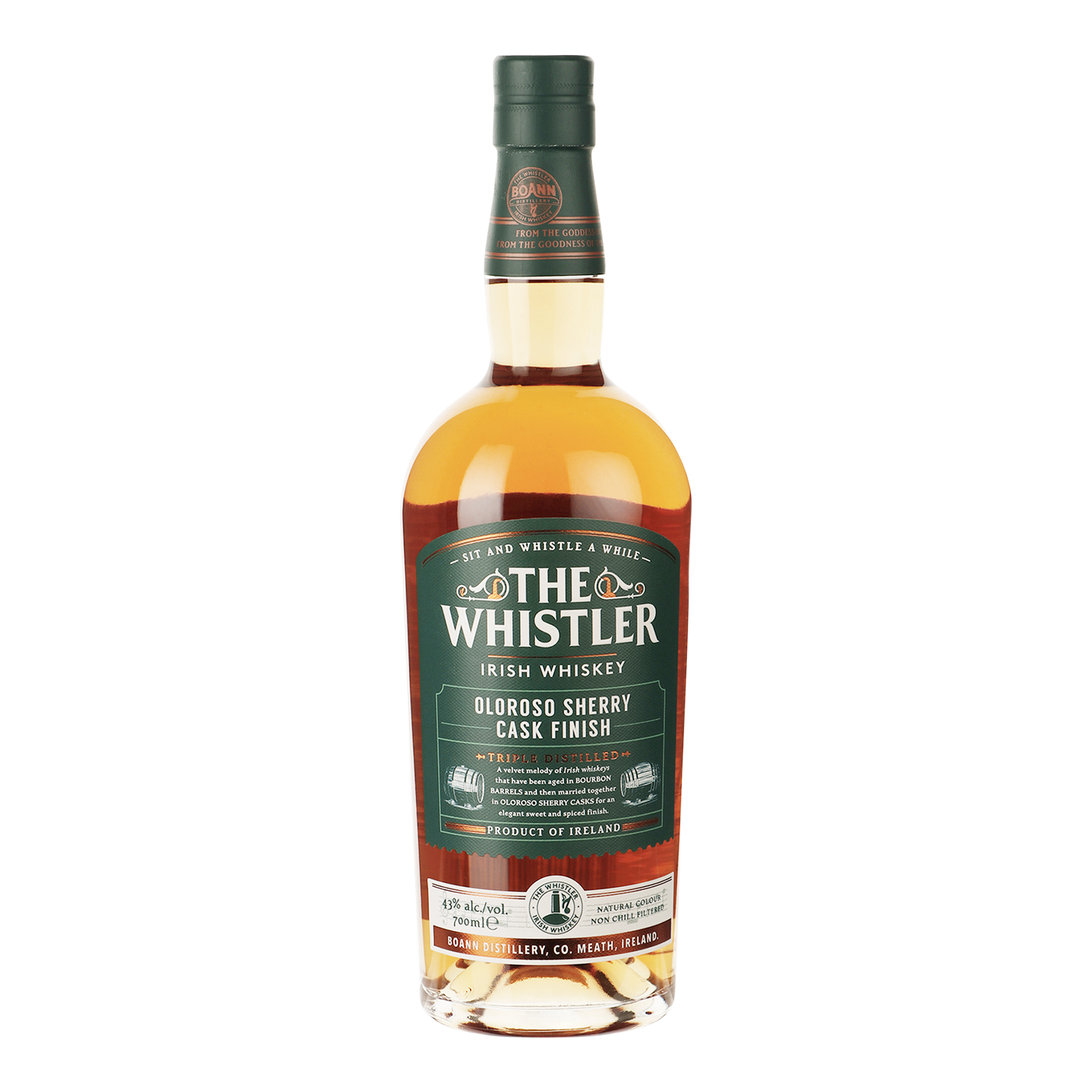 The Whistler Oloroso Cask Finish is drie keer gedistilleerd, waardoor hij extra zacht is. Het is een blend van de beste Ierse mout- en graanwhisky's, gerijpt in twee soorten vaten: ex-bourbon en oloroso sherry. De bourbon vaten geven de whisky zijn zoete warmte en de oloroso vaten leveren de unieke fruitige tonen welke synoniem staan voor the Whistler. De verhouding van de blend is 35% single malt whiskey en 65% graanwhiskey. Non-chill filtered en in zijn natuurlijke kleur.