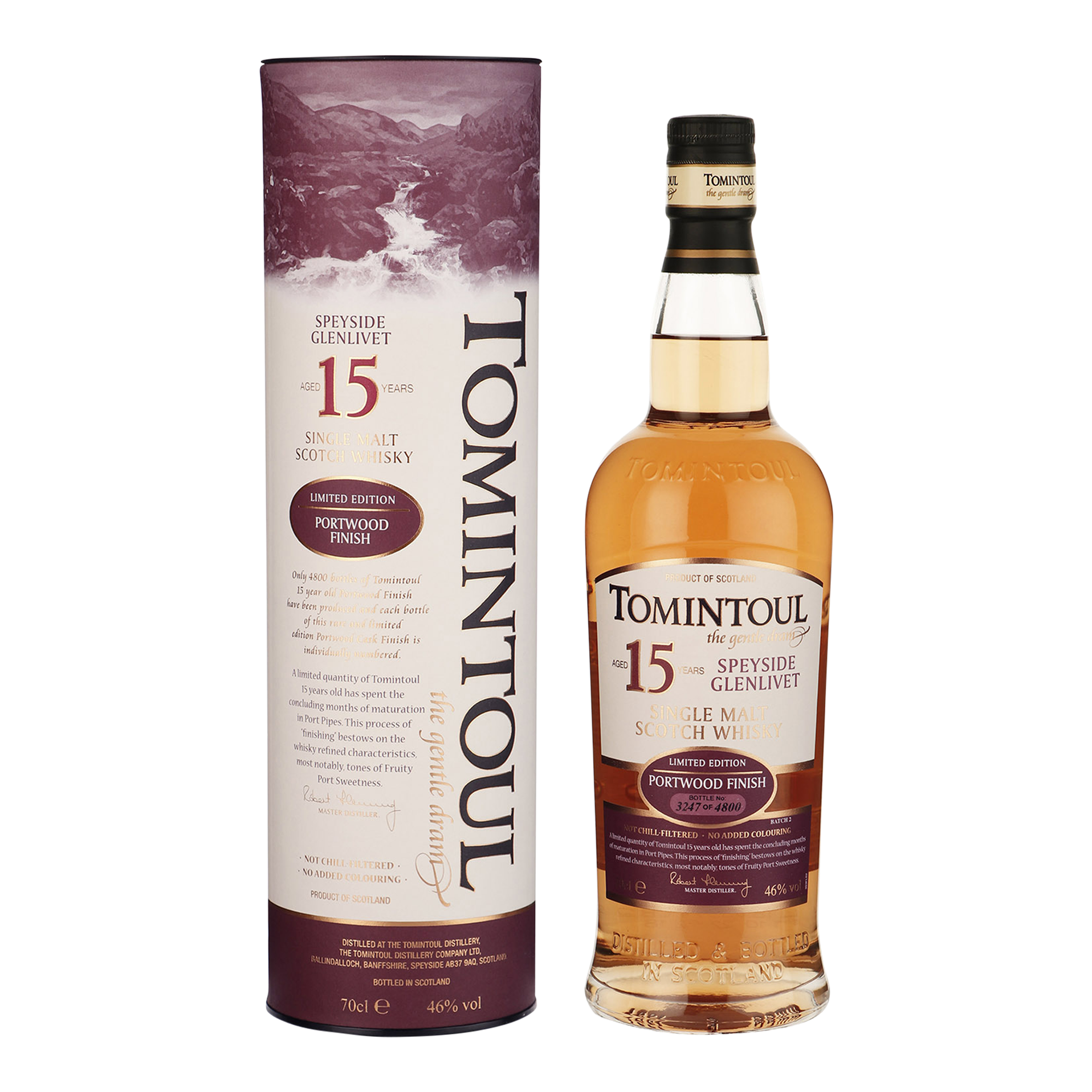 De Master Distiller van Tomintoul vond dat de tijd rijp was om de whisky op vijftienjarige leeftijd te bottelen, toen de subtiele smaaktonen van deze single malt whisky een schitterende harmonie hadden bereikt met de zoete eigenschappen van Port.