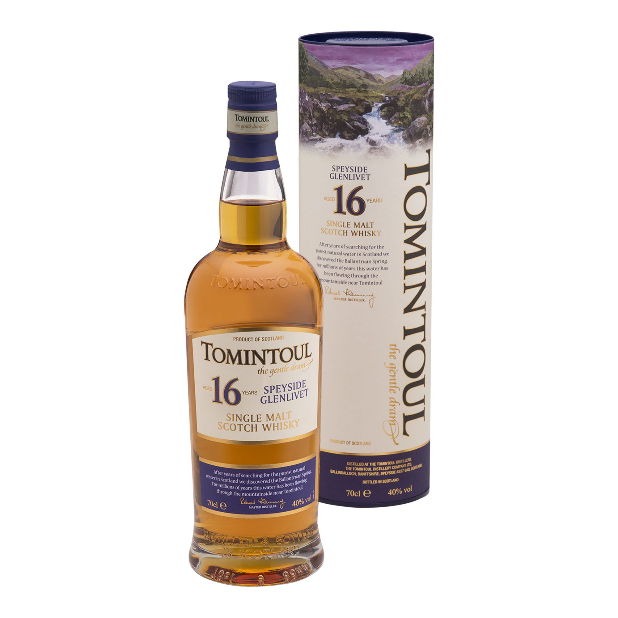 In het midden van de vorige eeuw duurde het meer dan een jaar om een waterbron te vinden die benut zou kunnen worden om malt whisky te produceren. De zoektocht eindigde met de ontdekking van de Ballantruan Spring, een bijzondere bron met het zuiverste water, genesteld in de Cromdale Hills. Vlakbij, aan de majestueuze Avon River, werd vervolgens de Tomintoul Distillery gebouwd. De natuurlijke omgeving, de hoge ligging, de zuivere lucht en de hoge kwaliteit water uit de Ballantruan Spring dragen bij aan de uitzonderlijke kwaliteit van Tomintoul Speyside Glenlivet single malt: "the gentle dram". Angus Dundee Distillers, de eigenaar van de Tomintoul Distillery, bracht samen met een team van goed opgeleide medewerkers de distilleerderij tot bloei.