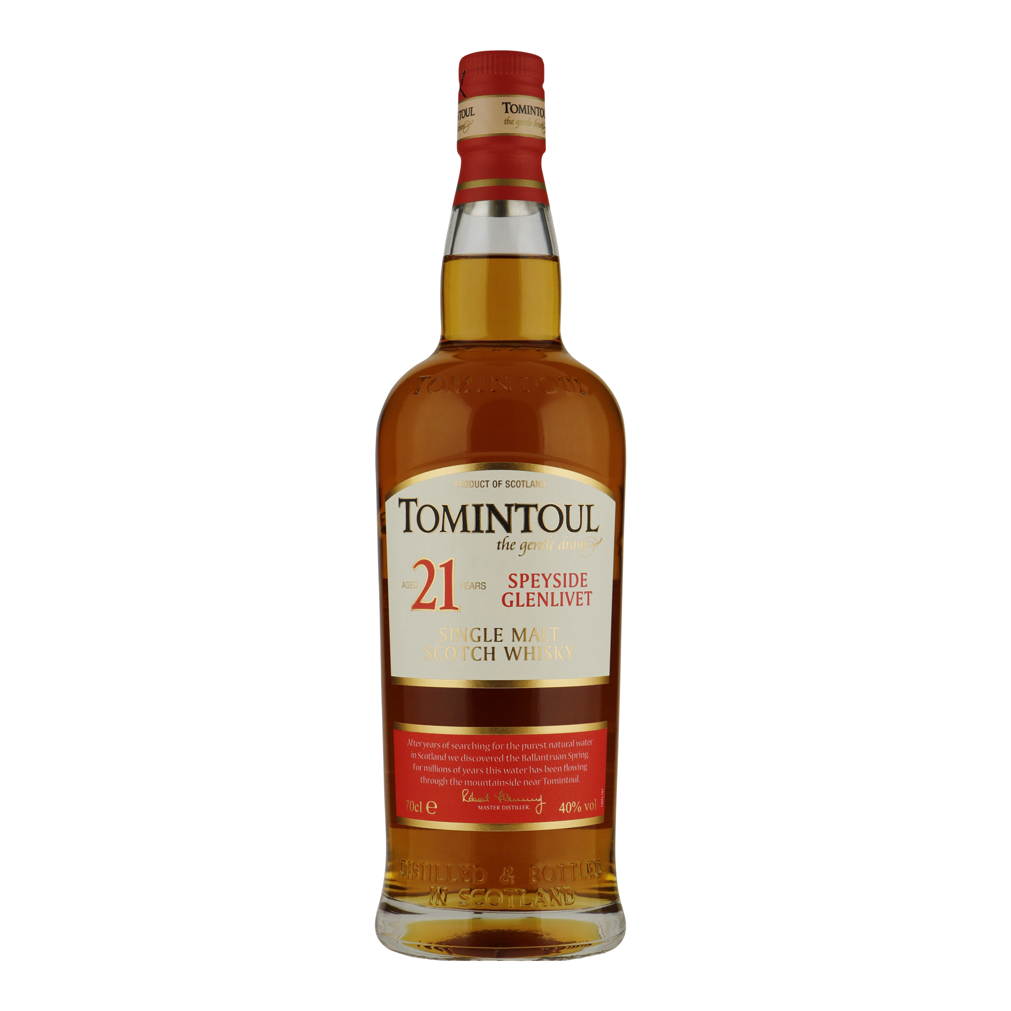 In het midden van de vorige eeuw duurde het meer dan een jaar om een waterbron te vinden die benut zou kunnen worden om malt whisky te produceren. De zoektocht eindigde met de ontdekking van de Ballantruan Spring, een bijzondere bron met het zuiverste water, genesteld in de Cromdale Hills. Vlakbij, aan de majestueuze Avon River, werd vervolgens de Tomintoul Distillery gebouwd. De natuurlijke omgeving, de hoge ligging, de zuivere lucht en de hoge kwaliteit water uit de Ballantruan Spring dragen bij aan de uitzonderlijke kwaliteit van Tomintoul Speyside Glenlivet single malt: "the gentle dram". Angus Dundee Distillers, de eigenaar van de Tomintoul Distillery, bracht samen met een team van goed opgeleide medewerkers de distilleerderij tot bloei.