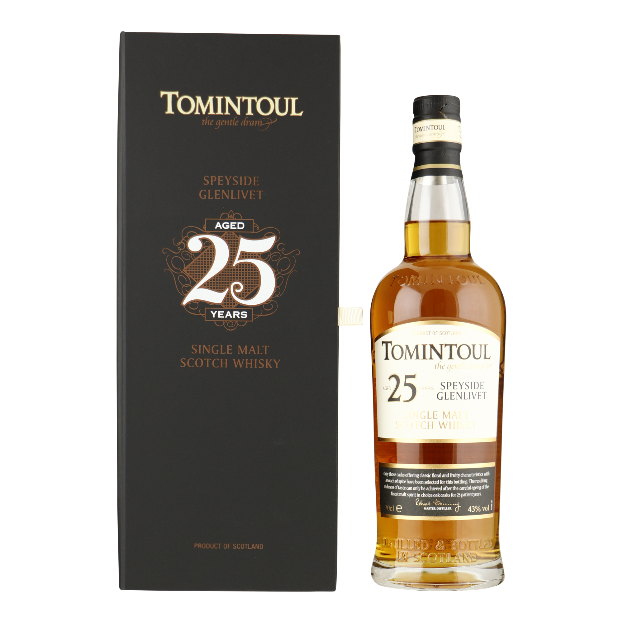 Deze prachtig uitgebalanceerde en complexe Tomintoul 25 jaar oud is krachtig, rijk en fruitig met een lange afdronk. Een uitzonderlijke dram die zorgvuldig is samengesteld door Master Distiller, Robert Fleming.